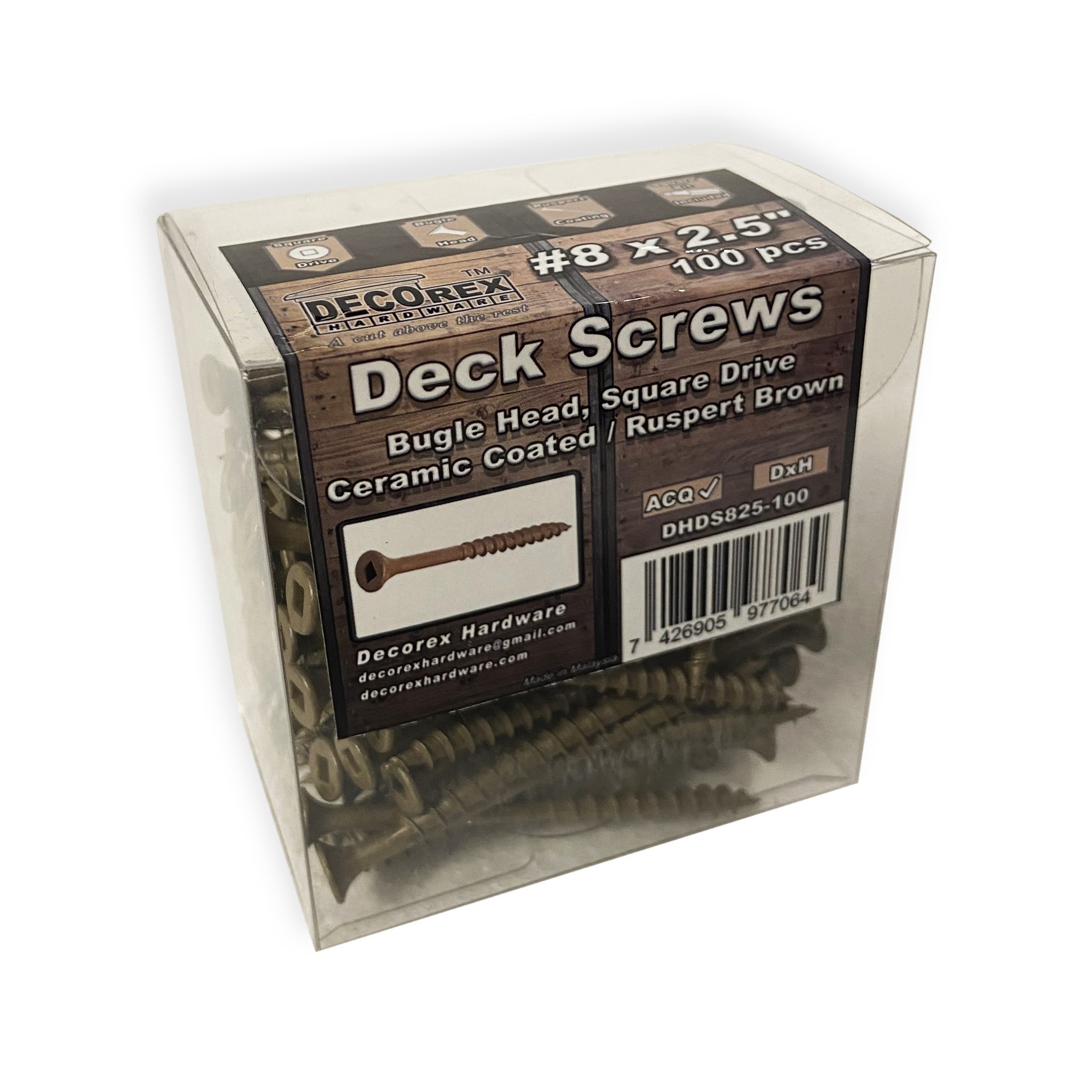 Are you starting a new decking project? You need reliable materials? Search no further! Decorex Hardware #8 x 2 1/2″ Deck Screws are created to give your construction reliability for many years to come. We make sure that even our smallest product meets your requirements. In combination with products from the Decorex Hardware family you will create the design of your dreams. These Decorex Hardware Deck Screws are made for treated wood and are designed to be used with a square drive bit. Square head is superior to Philips head because it doesn’t strip easily. These self-tapping screws have a bugle head and a coarse thread. They are made of steel with a Ruspert Brown finish.